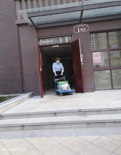 每每看到她拉著板車,低頭對照手機里業(yè)戶的生活物資清單,內(nèi)心無法克制的暖流翻涌,眼淚漸漸盈眶。她可以選擇不聞不問、裝聾作啞,也可以選擇推脫或是草草了事,但是她沒有退后,不僅給隔離戶提供所需物資,還有應(yīng)必答。